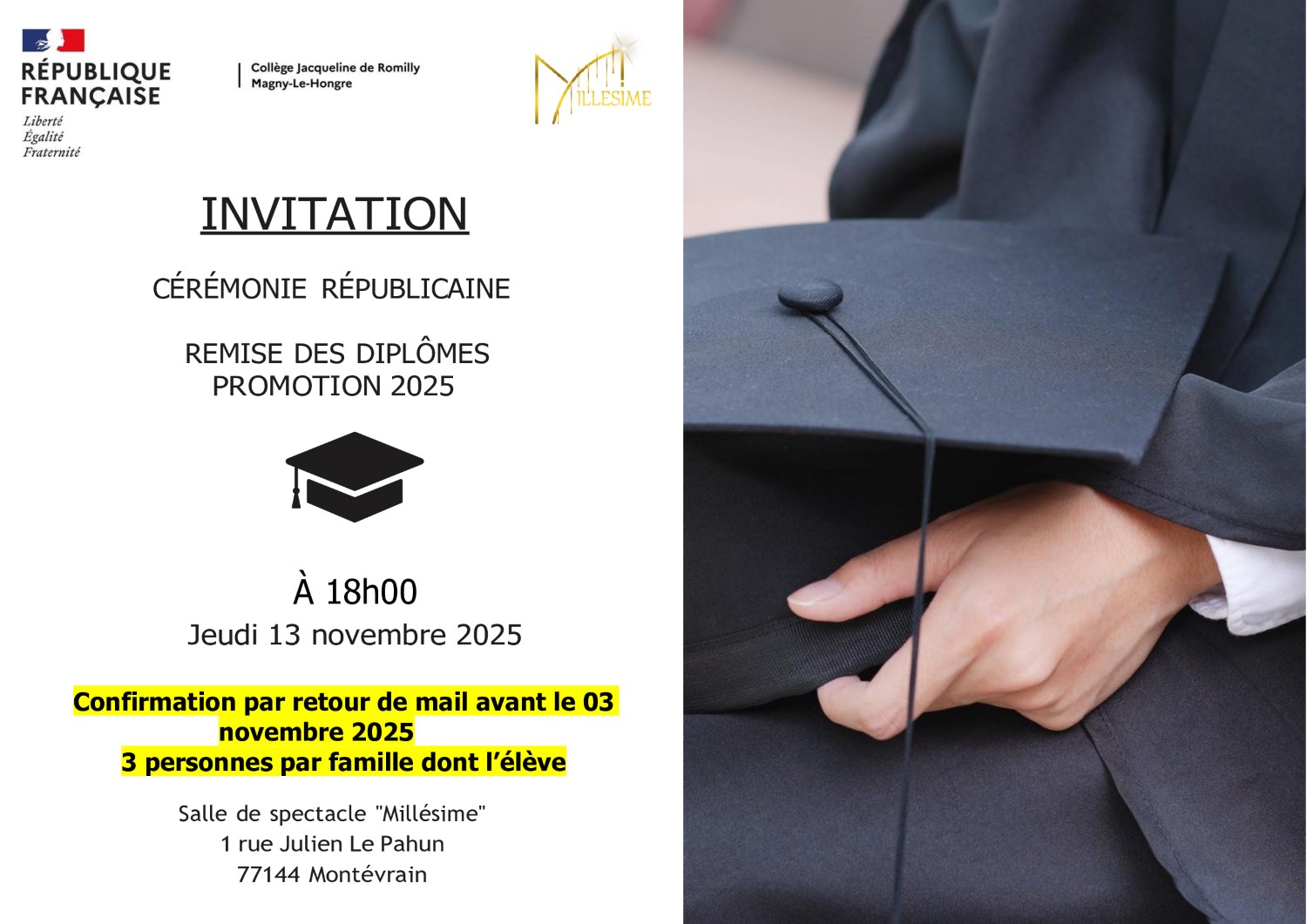 | Lettre d'information de Mme Lulin-Rivière, principale du collège, sur les modalités pour assister à la cérémonie. |