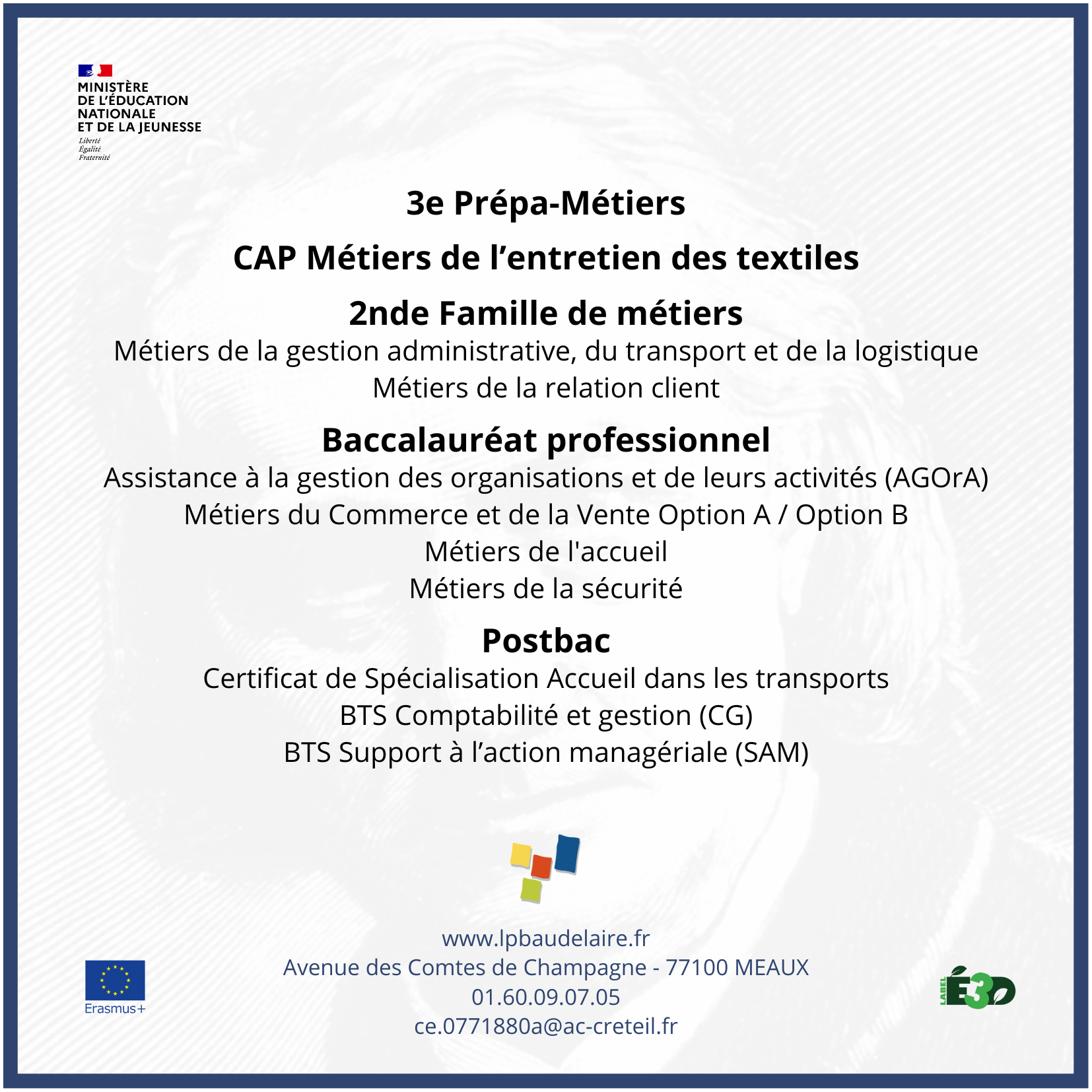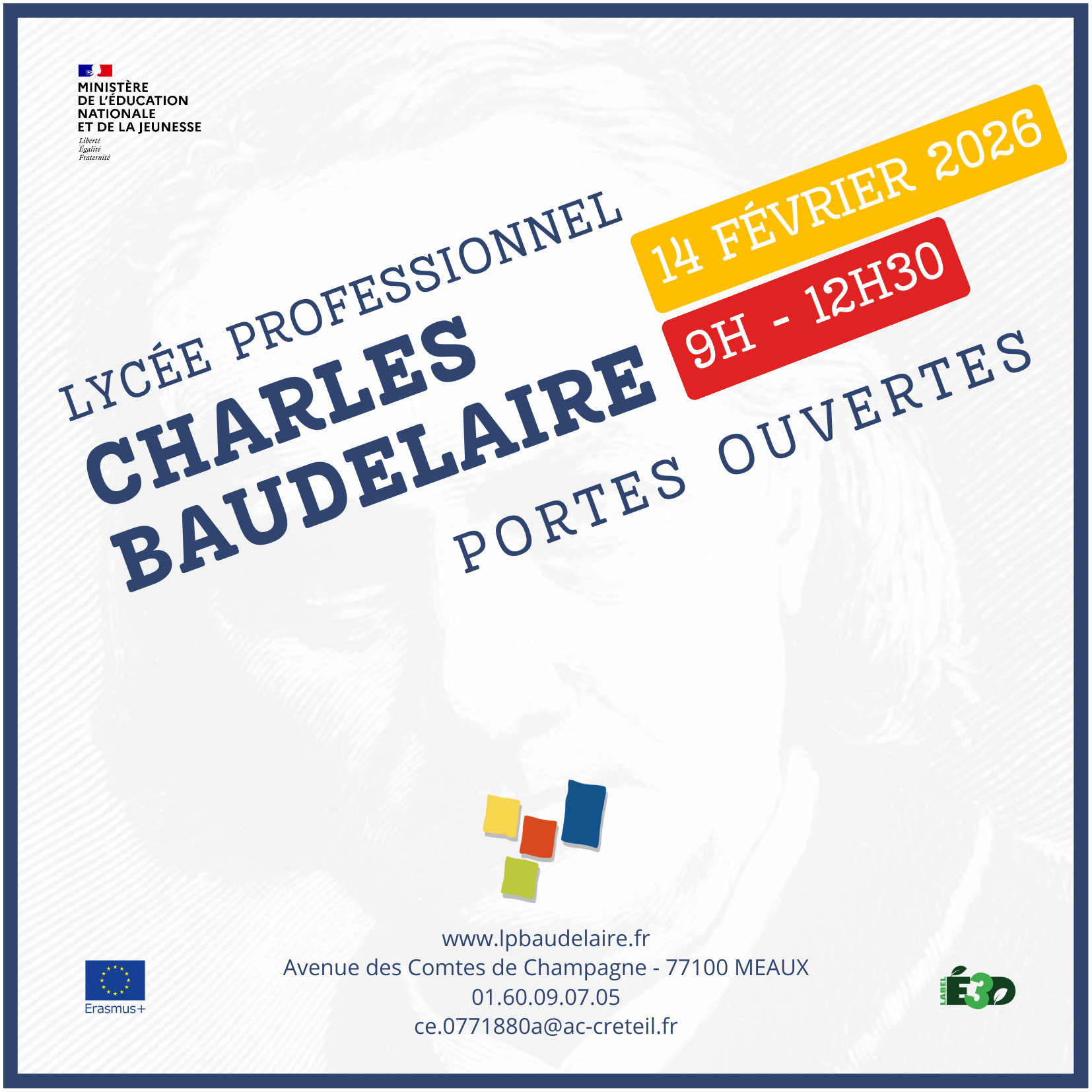Nous vous informons que le lycée professionnel Charles Baudelaire de Meaux organise sa matinée Portes ouvertes le Samedi 14 février 2026 de 9h00 à 12h30.