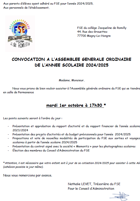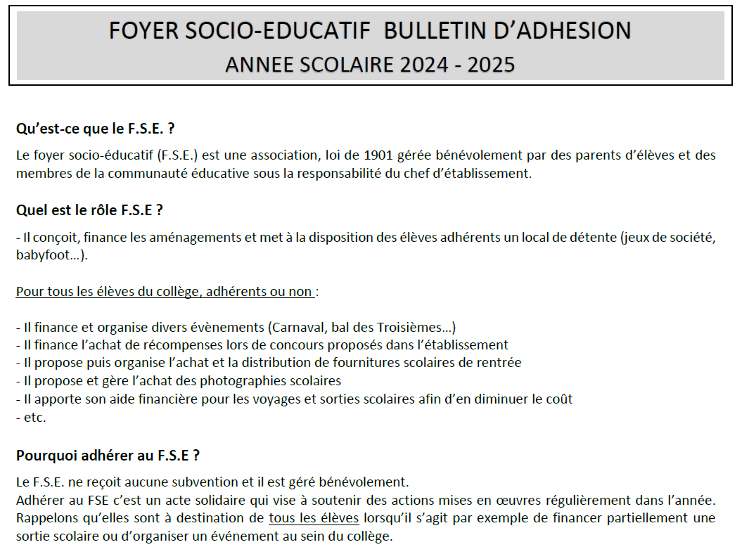 Le bulletin d'inscription au Foyer Socio-Educatif pour l'année 2024-2025 a été remis lors de la journée de pré-rentrée. Il est conseillé de payer par chèque.