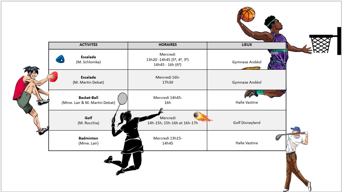 Vous trouverez ici en téléchargement le planning des activités et formulaire d'inscription à l'Association Sportive